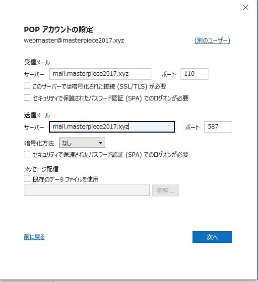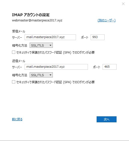 | サーバー | サーバーには mail.お使いのドメイン を入力して下さい |