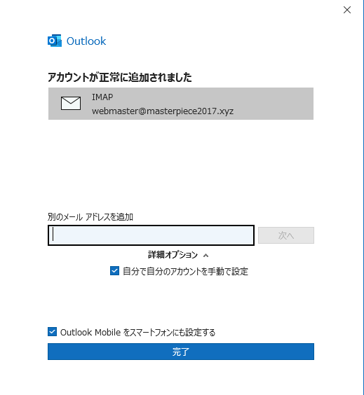 正しい場合は下記のようにアカウントが正常に追加されましたが表示されますので完了します。