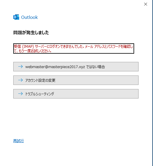 パスワードなどが違うときは下記エラーが出ますので、「→アカウント設定の変更」を押して下さい。