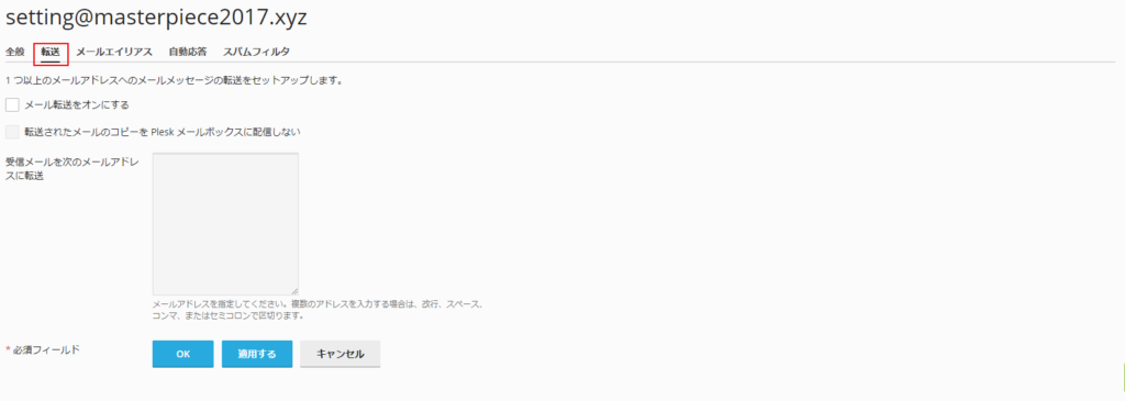 | 転送されたメールのコピーを Plesk メールボックスに配信しない | これは転送したら元のメッセージを残さないようにする設定です。 転送後メールは削除されますので容量が増え続ける場合のみチェックを入れるようにして下さい。 |